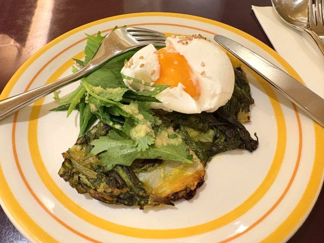 「春菊とグリーンキムチパンケーキ - ポーチドエッグ、コリアンダー、ジンジャードレッシング」は、ベトナムの“バインセオ”と韓国の“チヂミ”に着想を得て、日本の旬野菜「春菊」と自家製「グリーンキムチ」を組み合わせた一皿。