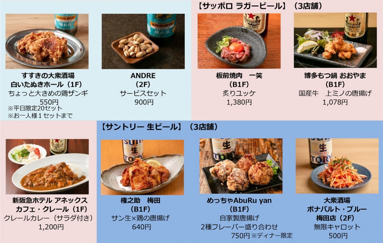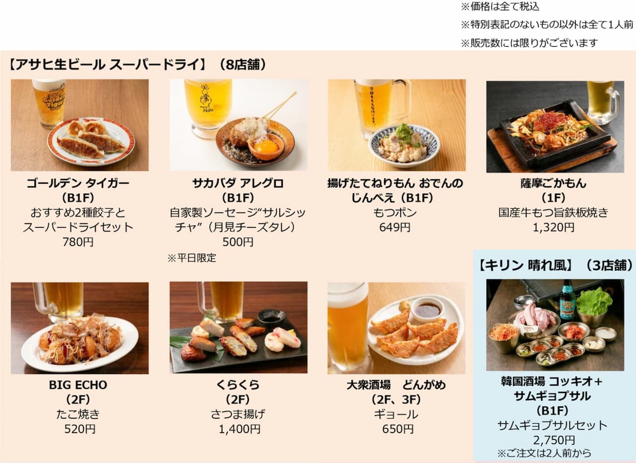 本イベントでは、「アサヒスーパードライ」(アサヒ)、「晴れ風」(キリン)、「赤星(ラガービール)」(サッポロ)、「サントリー生ビール」(サントリー)の4大メーカーのビールが飲めるだけでなく、「D.D.HOUSE」内の飲食店17店舗がビールと“ベストマッチ”すると思うイチオシフードをセットで提供!
