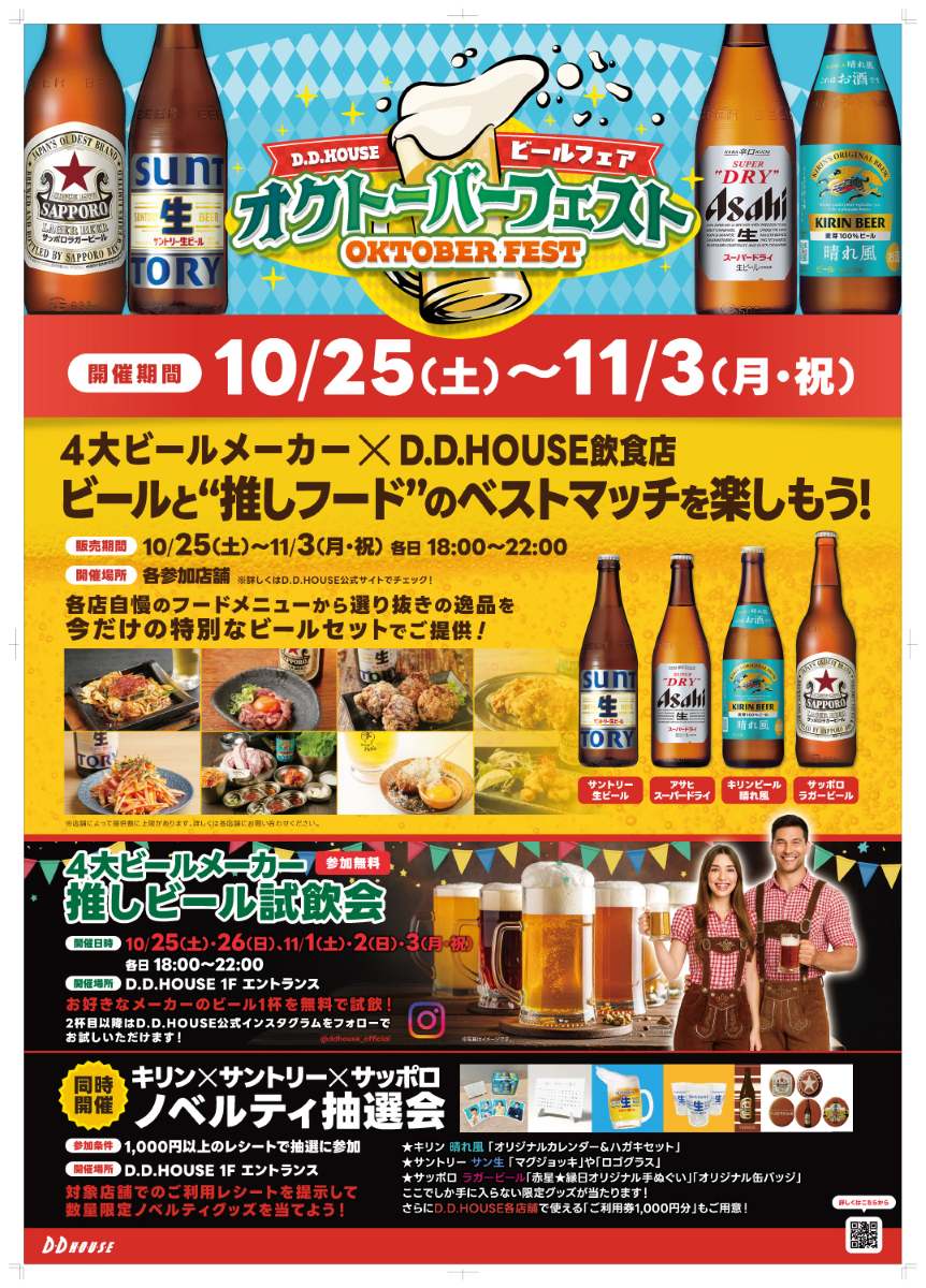 2025年10月25日(土)~11月3日(月・祝)の期間中、大阪・梅田にある複合施設「D.D.HOUSE」で「D.D.HOUSE オクトーバーフェスト」が開催。4大ビールメーカーのビールとイチオシフードが楽しめるイベントです。