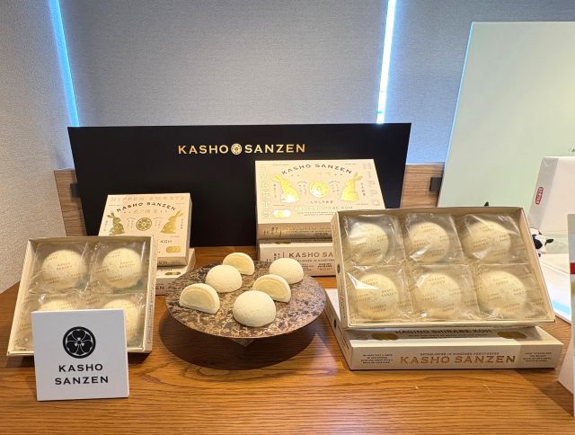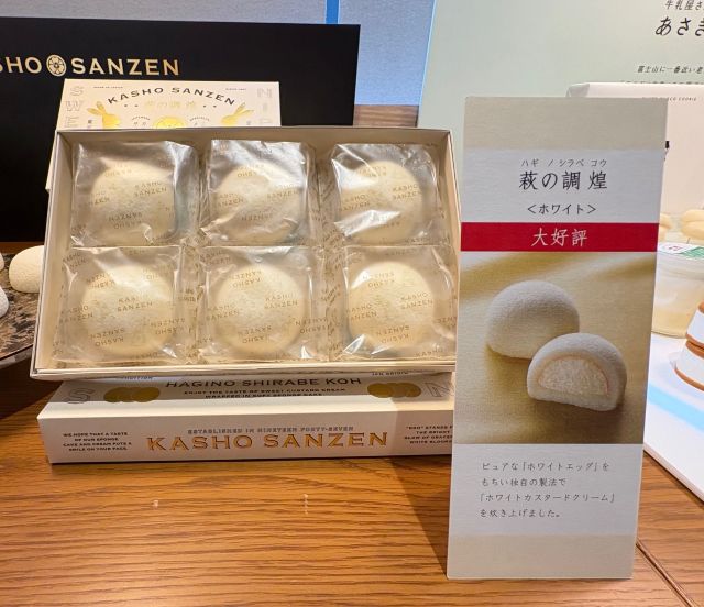 仙台銘菓「萩の月」でおなじみの菓匠三全から、新しい日本の銘菓をめざした姉妹品「萩の調 煌(はぎのしらべ こう)」が西日本初上陸。ホワイトエッグで作るホワイトカスタードクリームのやさしい甘さが特長で、上品な味わいが楽しめます。