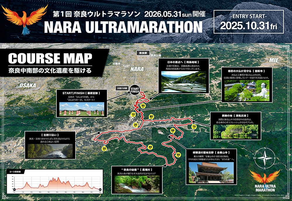 スタート地点は、日本初の本格的な都「藤原宮跡」。古代の息吹が残るこの地から明日香村、吉野川沿い、そして世界遺産・金峯山寺へと続く壮大な100kmコースがランナーを待ち受けます。