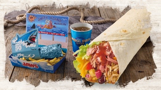造船所をモチーフにした「アミティ・ランディング・レストラン」では、ブリトーメニューをメインにフルリニューアル! スペシャル・メニュー「スパイシーシュリンプ・ブリトーセット」をはじめ、チキン&アボカド、バーベキューポーク、チリコンカンビーンズと、ボリューム満点で食べ応え抜群のブリトーがそろいます。映画公開50周年を記念したスペシャルパッケージにも注目です。