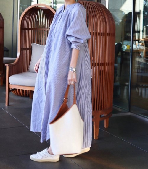 正中雅子さんが着ているストライプ柄のワンピースであれば、さわやかなコーディネートが完成しますね。小物を白で統一することで、全体がすっきりとした夏っぽい印象に仕上がります。