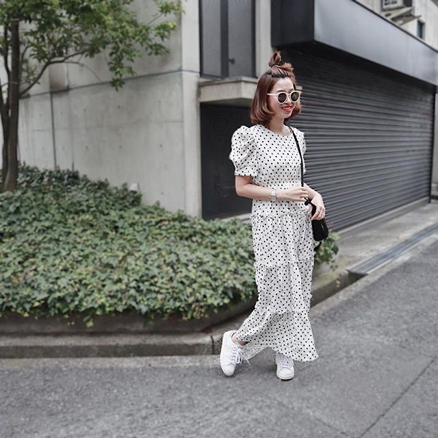 ■5:ガーリーなドットワンピース。アクティブな日にはスニーカーを合わせて(大橋あゆみ)