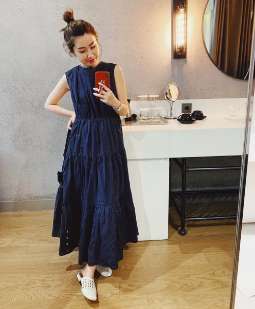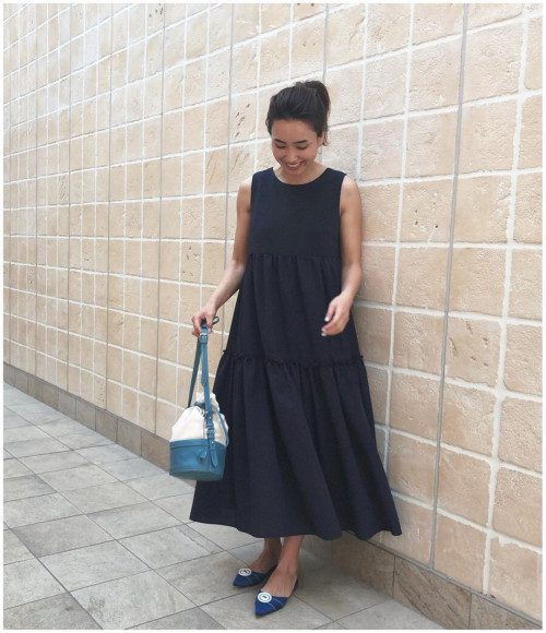 大橋あゆみさんが着ているこちらのネイビーのワンピース、超ロング丈ですが素材も軽いので重たく見えず、これからの季節にぴったりです。とても楽に着られるのに、シューズを変えるだけでちょっとしたお呼ばれパーティーにも使えます。
