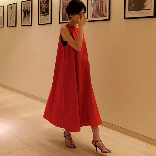 正中雅子さんが着こなすこちらのワンピースは、トレンドの赤が鮮やかなノースリーブワンピ。