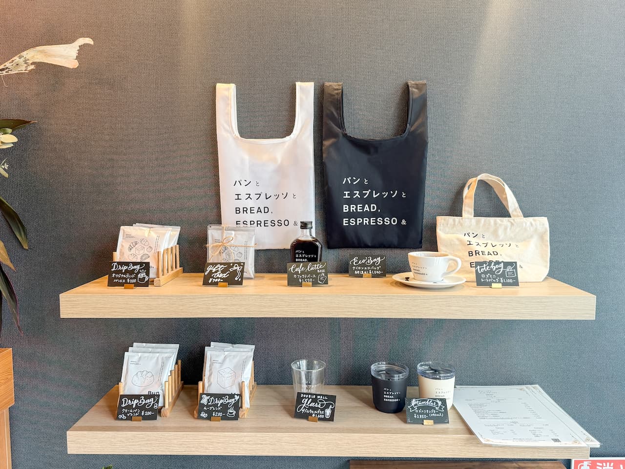 クレープを楽しんだあとは、ショップスペースにも注目して。店頭では、モノトーンの色合いがすてきな「パンとエスプレッソと」のオリジナルグッズやドリップコーヒー、「カフェラテベース」などが販売されているので、おうちでもゆっくりカフェ気分を味わえます。