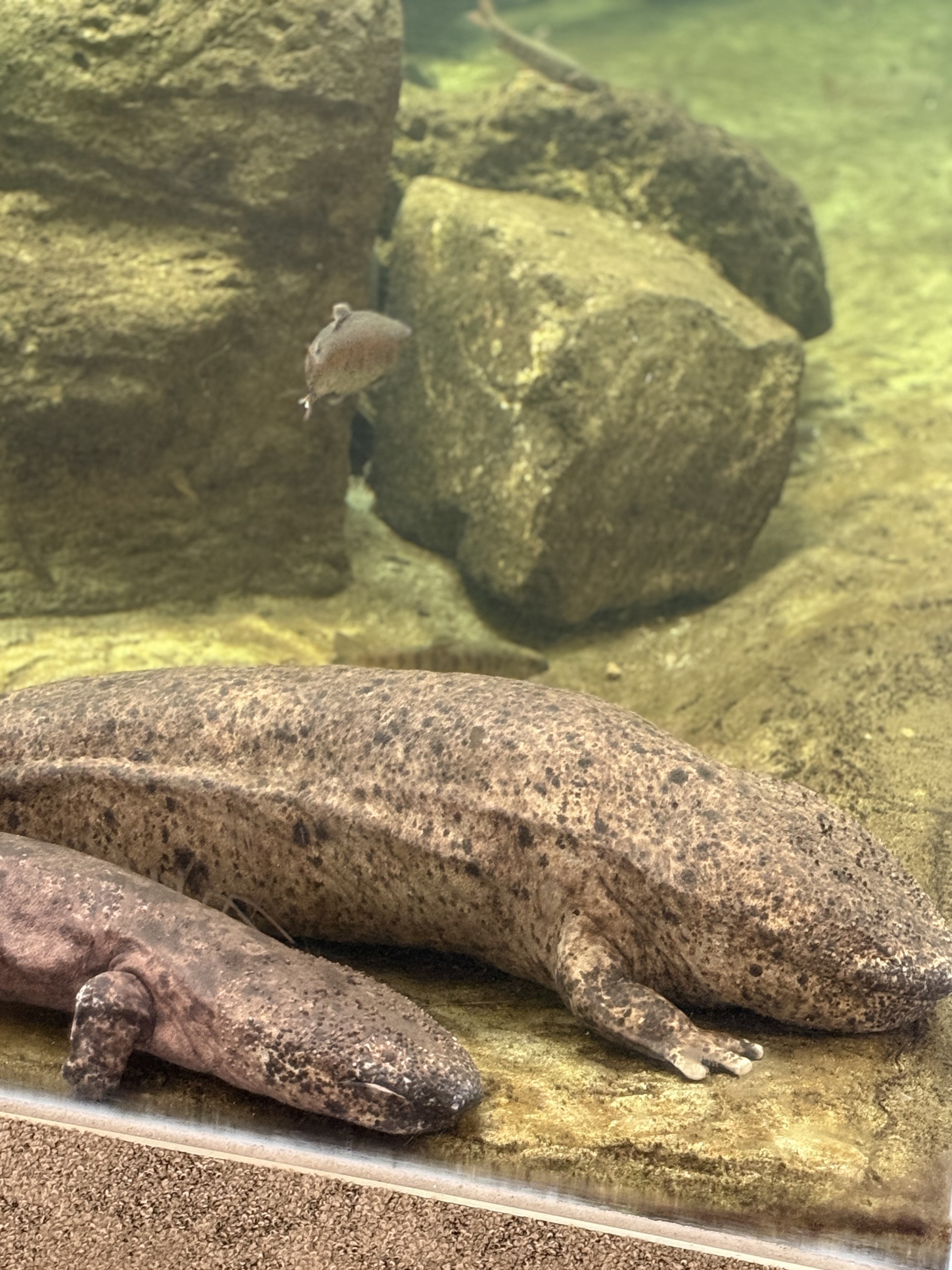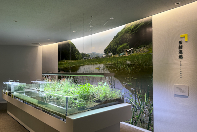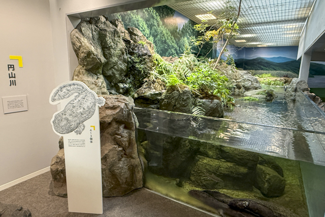 エントランス付近には、地元を流れる円山川の生態系を再現した水槽も。同じく説明書き付きで、「オオサンショウウオ」の豆知識や「オイカワ」の生態の秘密がわかりやすい言葉でまとめられ、一つひとつじっくり読みたくなります。