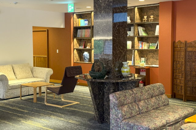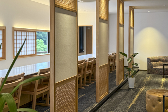 貸切露天風呂や外湯めぐりを楽しんだ後は、最上階のラウンジスペースでくつろぐぜいたくなひとときを。コーヒーマシンやデトックスウォーター、アイスクリームなどを自由に利用でき、食事前の休憩や湯上がりにぴったりです。城崎や旅をテーマにした書籍が並ぶライブラリーも設置され、本を眺めながら穏やかな時間が過ごせます。