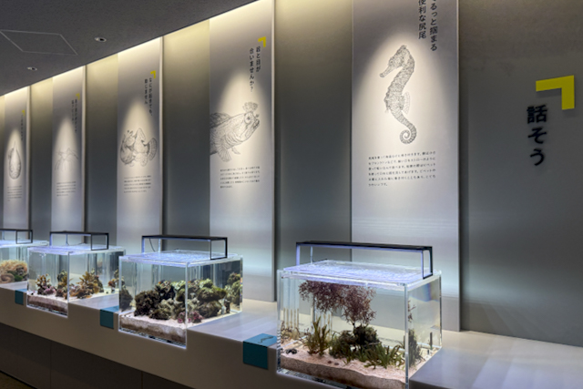 昨年、ひと足先にリニューアルした「SeaZoo」エリアには、20個ものキューブ型水槽が出現し、多彩な生きものたちをスタイリッシュに展示。それぞれの展示には、生きもののイラストと飼育員たちによる説明書きが添えられています。説明書きには、飼育員が日々の観察からわかったことなどがわかりやすく記されており、生きものをより身近に感じられます。