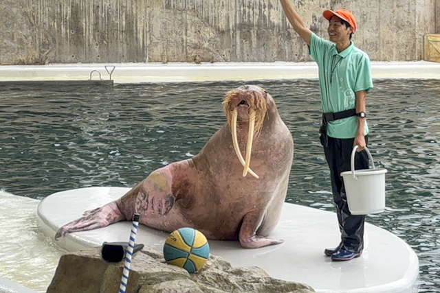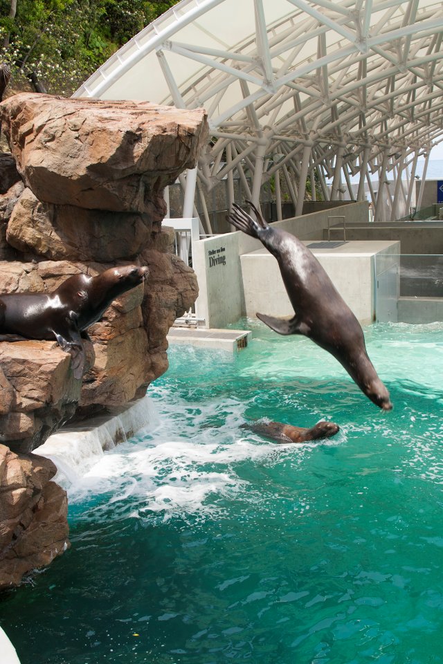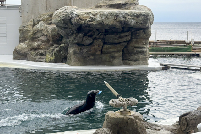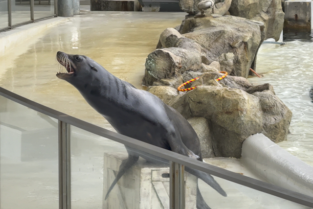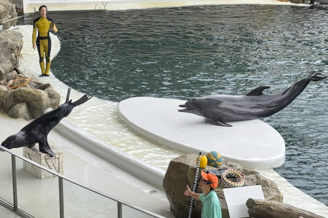 イルカとアシカがコラボレーションした「イルカ・アシカショー」では、飼育員との息ぴったりなパフォーマンスや異なる種族である2頭の見事なシンクロ具合にびっくり! 約700kgもあるセイウチもかわいらしい姿を見せてくれました。
