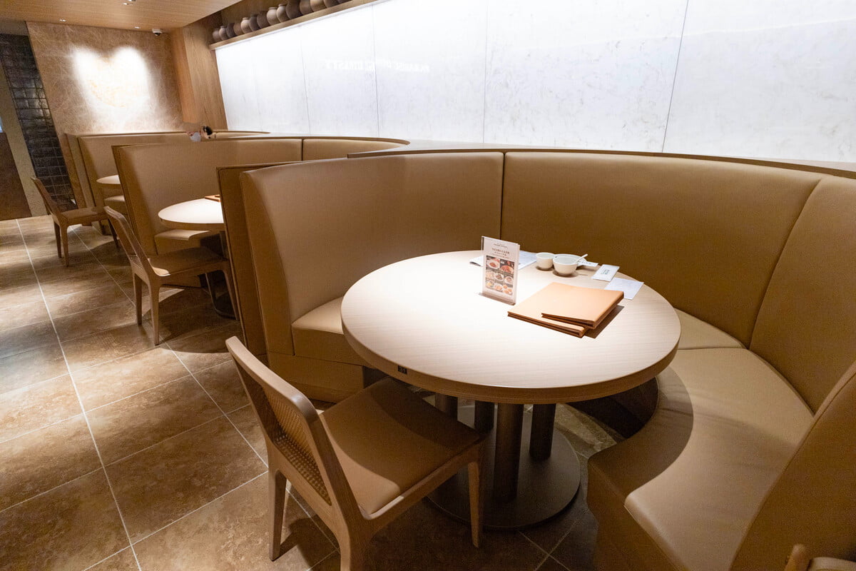 店内は木目を基調とした落ち着いた空間で、ゆったり過ごせる雰囲気。ハイバックソファのボックス席や円卓、回転テーブル付きの半個室など、さまざまなシーンに対応できる席が揃っています。