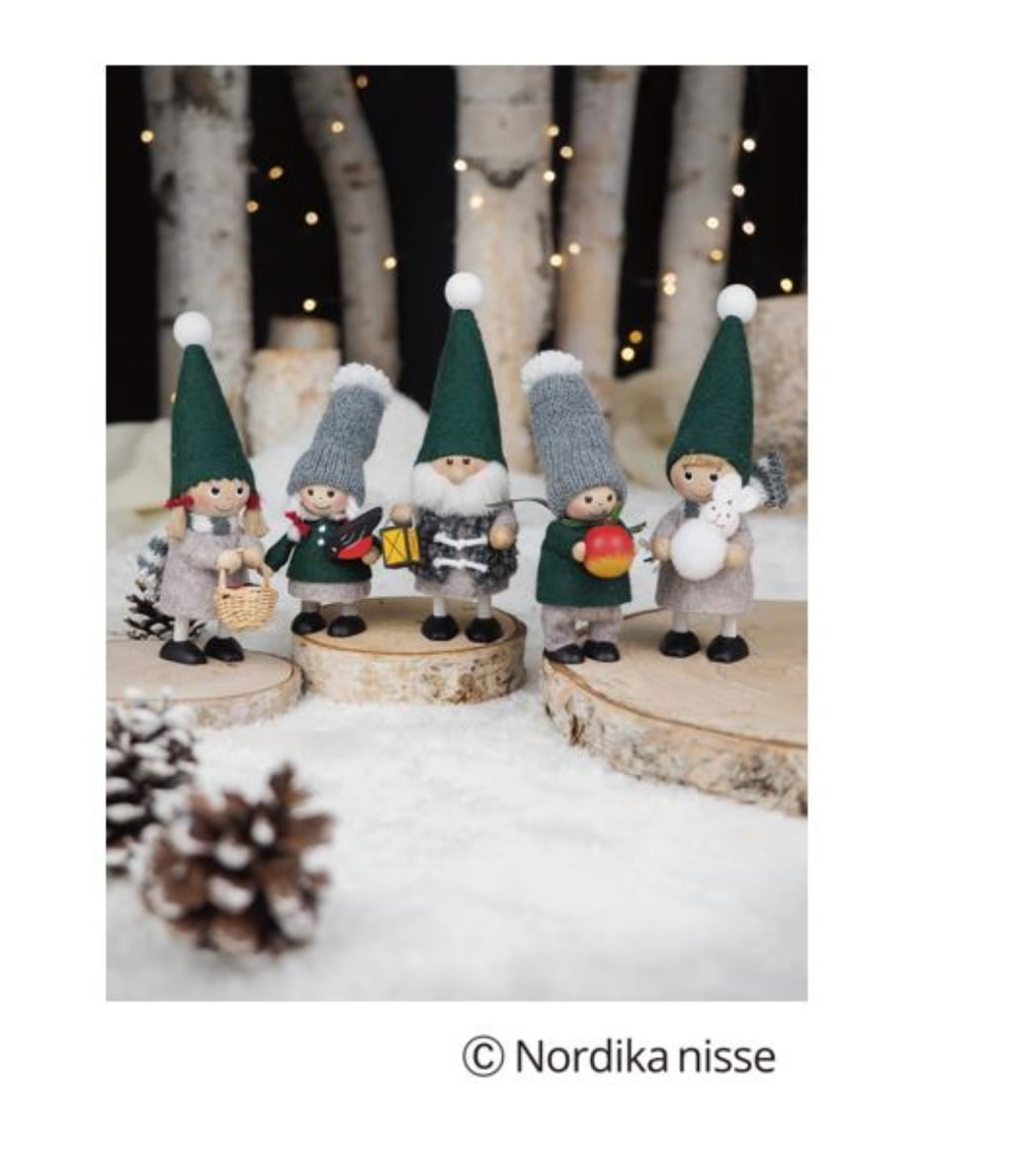 「ノルディカニッセ」の「ノルディックフォレストシリーズ」。「ベリー摘みの女の子」「ランタンを持ったサンタ」「ウサギを抱えた男の子」(各6,600円)、「小鳥と話す女の子」「リンゴを持った男の子」(各6,160円) -