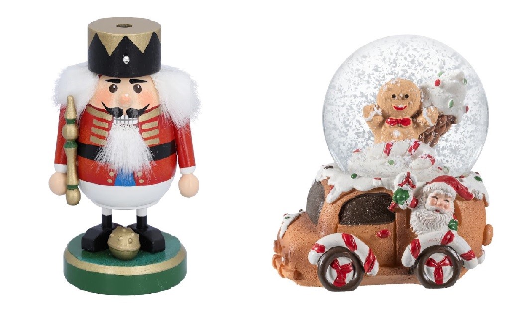 ケーテ・ウォルファルト(左)「ケーテ・オリジナル スモーキー 王様」(2025年版)(9,100円)、(右)「スノードーム“ジンジャーブレッドカー”」 (2,000円)