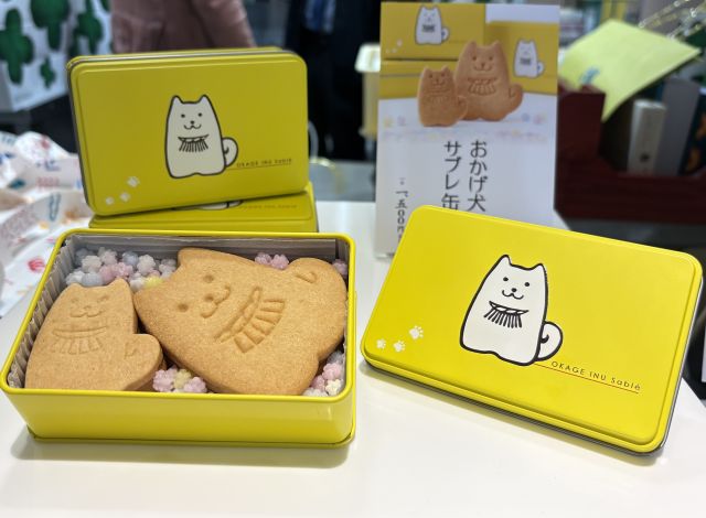 「おかげ犬サブレ 缶」は、阪神梅田本店での先行販売アイテム。三重県産小麦粉と国産バターを使ったサブレに金平糖を添えた、見た目も味もかわいい逸品です。