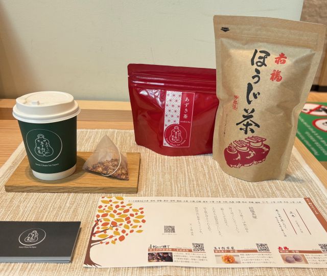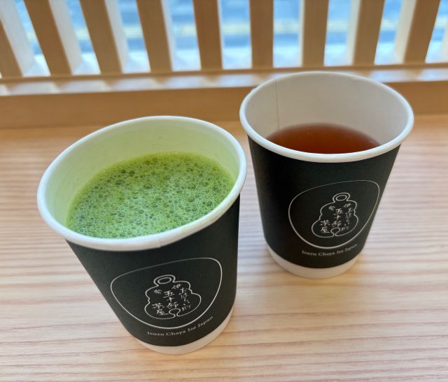 ドリンクは単品注文もOK。「あずき茶」は、北海道産あずきを香ばしく焙煎し、やさしい味わいを楽しめるノンカフェインのドリンク。「抹茶ラテ」は、赤福店舗で提供している抹茶を使用し、程よい甘みと抹茶の旨み感じる一杯。