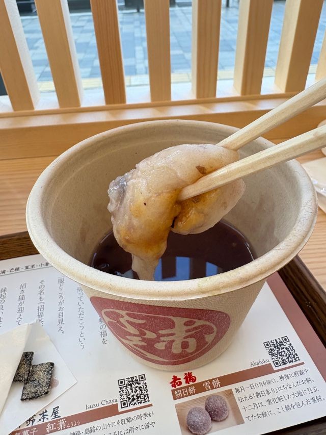 寒い季節に恋しくなる「赤福ぜんざい」は、絶対に味わっておきたい一杯。お餅は注文が入ってから焼き上げるスタイルで、香ばしさとやわらかさのコントラストが絶妙。ほうじ茶と塩昆布が添えられ、ほっとひと息つきたい時間にぴったりです。