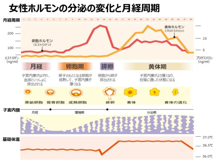 まず、月経周期にともなう女性ホルモンの変化を見てみます。