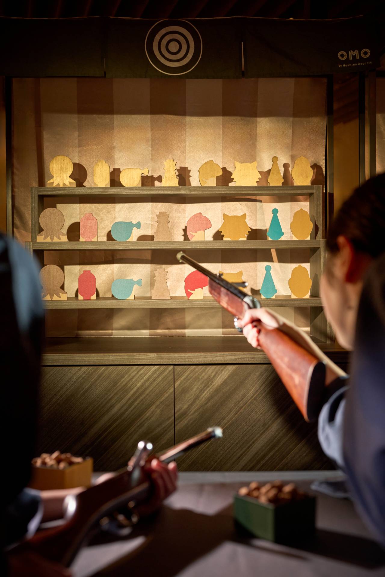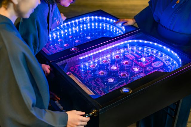 射的は、大阪にちなんだタコやふぐなどのシルエットが的に。スマートボールは、大阪の街のネオンサインをイメージしたデザインの板面で、いずれも遊び心たっぷり。夢中になって遊べ、景品には大阪生まれの駄菓子が用意されています。