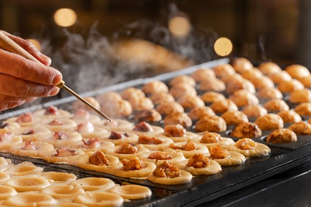 「なにわうまいもんグルメ」では、オリジナルグルメを提供。たこ焼き発祥のお店「会津屋」と共同で開発した、大阪名物のホルモンで作る「OMOラヂオ焼き~味噌ホルモン~」は、ホルモンのうまみが溶け出した味噌ダレが、熱々の生地と絶妙に絡み合うメニューです。