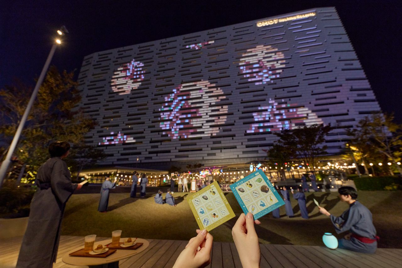 さらに、ホテル壁面の外装膜を使用し、宿泊者全員で参加できる巨大なBINGOも実施。OMO7大阪のBINGOは数字ではなく、大阪にまつわるイラストや関西弁で構成されていることもポイントです。