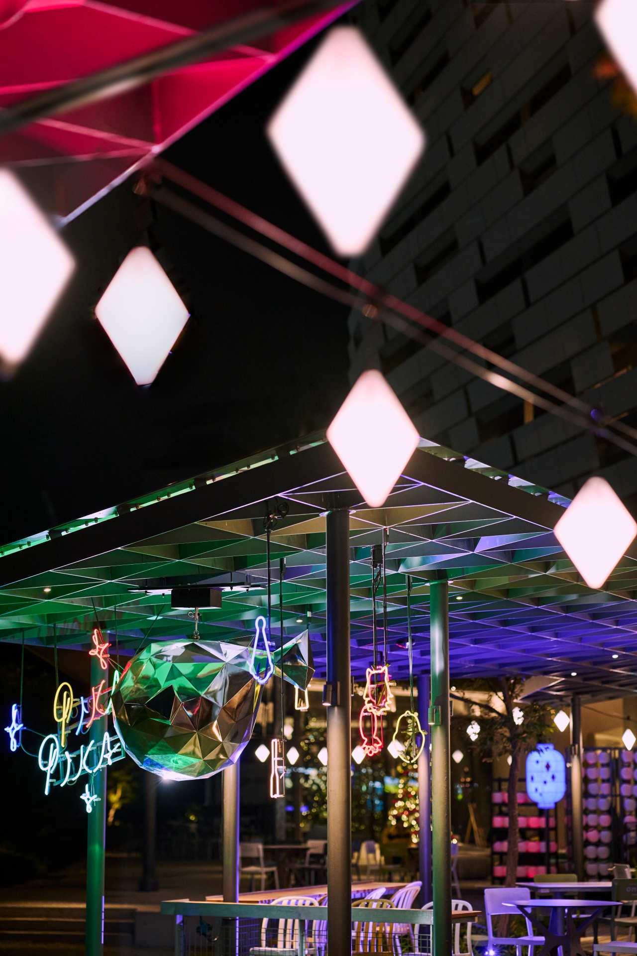 イベント時間になると、ガーデンエリアみやぐりんは、無数の提灯がやさしい明かりを灯す幻想的な空間へと様変わり。「PIKAPIKA横丁」を、新世界や道頓堀の賑わいを映し出す大きな張りぼて看板と、かつて新世界の夜を照らした「ふぐ」の形のミラーボールが彩ります。