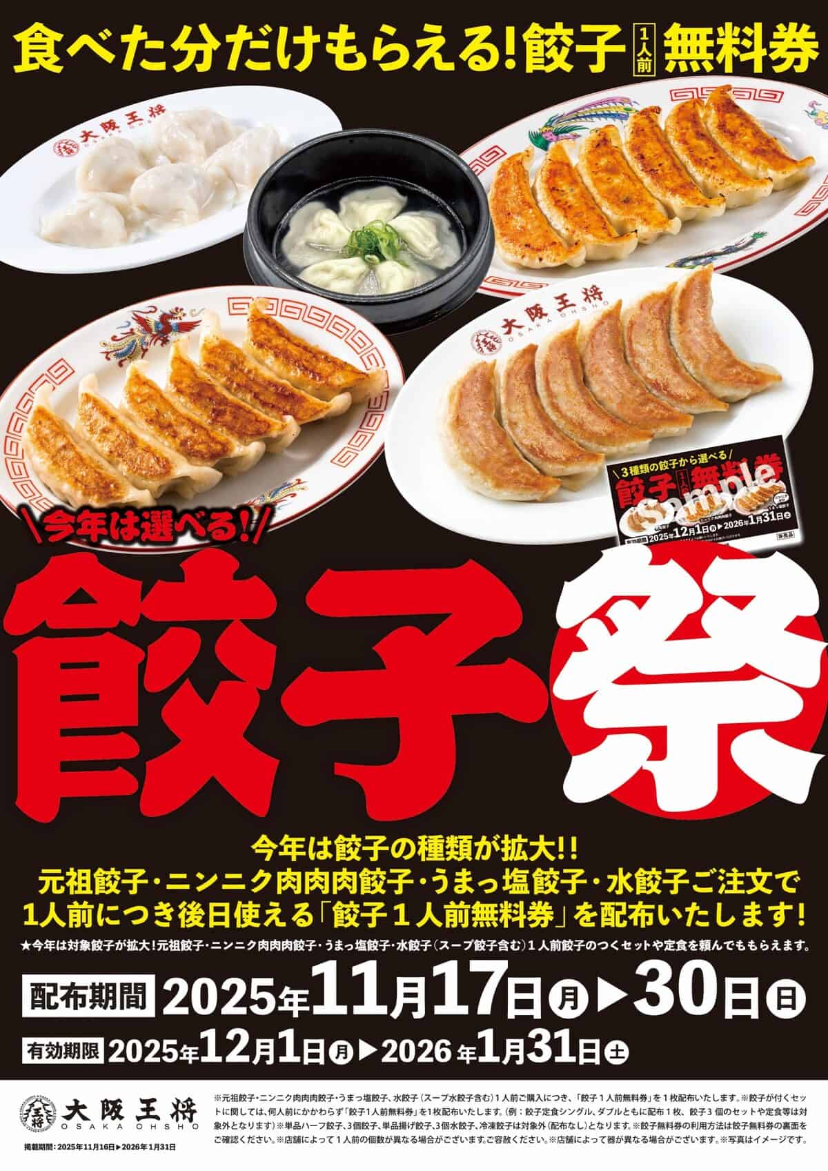 「大阪王将」の「餃子祭」は、期間中に店内飲食またはテイクアウトで「元祖餃子(焼・生)」「ニンニク肉肉肉餃子」「うまっ塩餃子」「水餃子」などを注文すると、餃子1人前につき「餃子1人前無料券」が1枚もらえるキャンペーン。