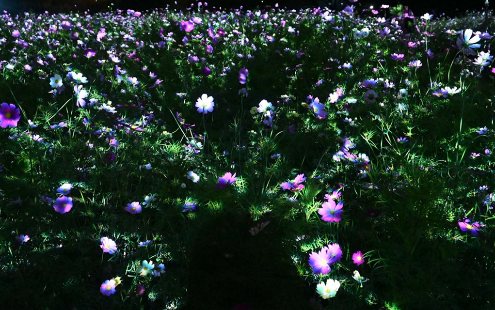 午後6時からは長居植物園の自然を活かした夜の野外ミュージアム「チームラボ ボタニカルガーデン 大阪」となり、コスモスが光り輝く作品『生命は闇に浮かぶまたたく光 - コスモス』へと様変わりします。