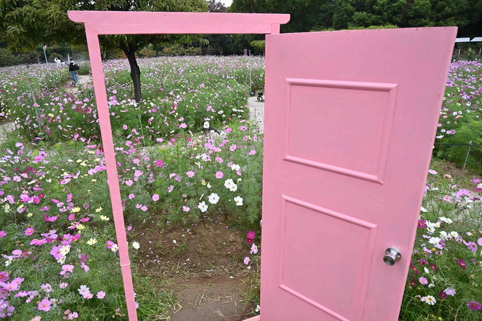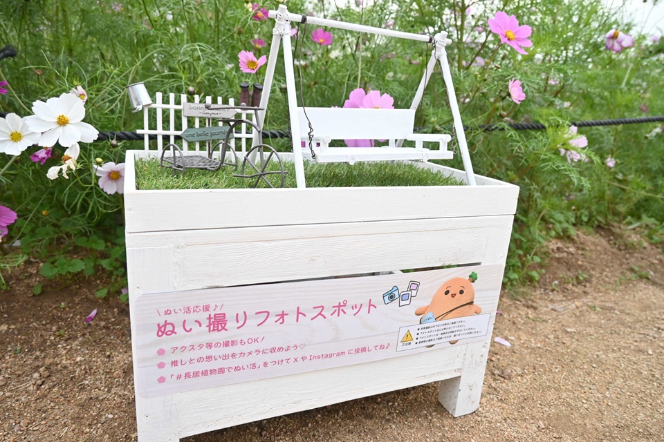 20,000株が植わるコスモス畑には、来園者が楽しめる仕掛けも。ピンク色のドアがあったり、カーブミラーがあったり。ぬいぐるみとの撮影を楽しめる「ぬい撮りフォトスポット」もありました。