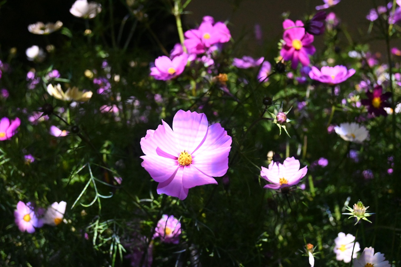 光り輝くコスモスは他の来園者と一緒に作り上げる作品でもあるのですね。光が当たる瞬間も当たらない瞬間も、それも含めて自然が織りなすアートなのだと感じました。