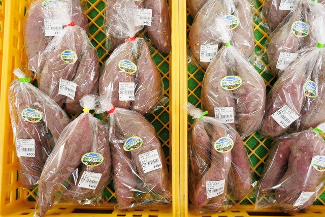 能勢ブランド野菜のひとつ「べにはるか(さつまいも)」。その甘さやほくほく感を満喫できる焼き芋をはじめ、大学芋や天ぷらにも最適です。 -