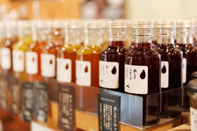 赤しそやゆず、いちご、うめ、メロン、ジンジャーなど多彩にそろうシロップ。その日の気分に合わせてお湯割りや炭酸割りなどで楽しんで。 -