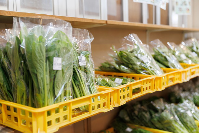 広い産直コーナーには、種類ごとにさまざまな野菜が並びます。買い回りしやすいのもポイントです!