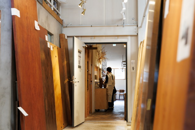 「MiTSUKeRUN」すぐ横の階段を上ると、そこは多彩な木の天板が並ぶギャラリースペース。木の種類、仕上げ、大きさによって印象をがらりと変える天板の数々は迫力満点です。天板が連なる道の向こうには、カフェ「閑日(かんじつ)」がのぞいています。