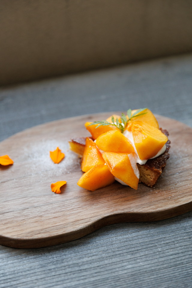 季節の米粉タルトは、秋が旬の柿を使用。シンプルでベーシックな味わいのタルト生地に甘さ控えめの生クリームを盛り付け、さらに甘い柿をこぼれるほどトッピングしています。