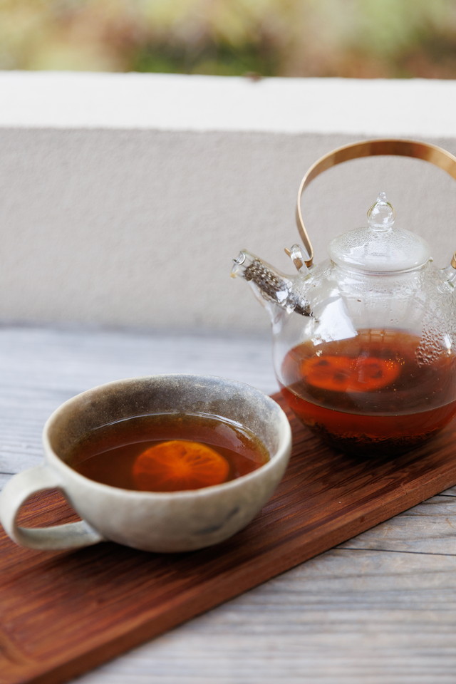老舗の紅茶専門店「musica tea(ムジカティー)」の紅茶を使ったフルーツティーも、時季によってレモンやカボスなど合わせる食材が変わります。訪れた日は、自家製のみかんとライムのシロップをプラス。まるでフレッシュな果実を味わっているような、芳醇なフレーバーを楽しんで。