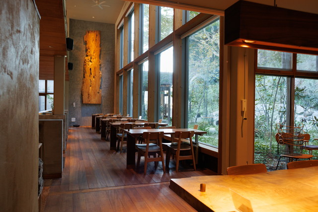 巨大な一枚板のオブジェが印象的な店内は、野趣あふれるお庭と裏山に面しています。11月には庭のモミジと山のイチョウが鮮やかに色づき、料理を待つ時間も目を楽しませてくれるはず。