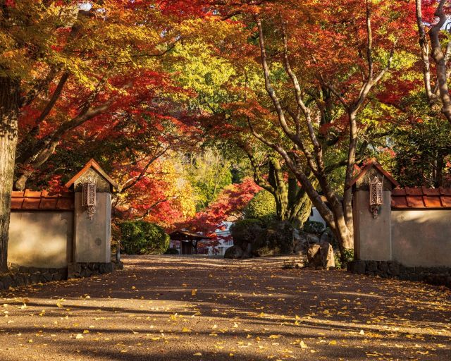 約5500坪の広大な庭園に囲まれ、例年11月中旬~12月上旬には紅葉の見ごろを迎えます。晩秋には、燃えるようなモミジの赤色とイチョウの黄色のハーモニーが一帯を埋めつくし、自然と名建築の融合も見どころです。