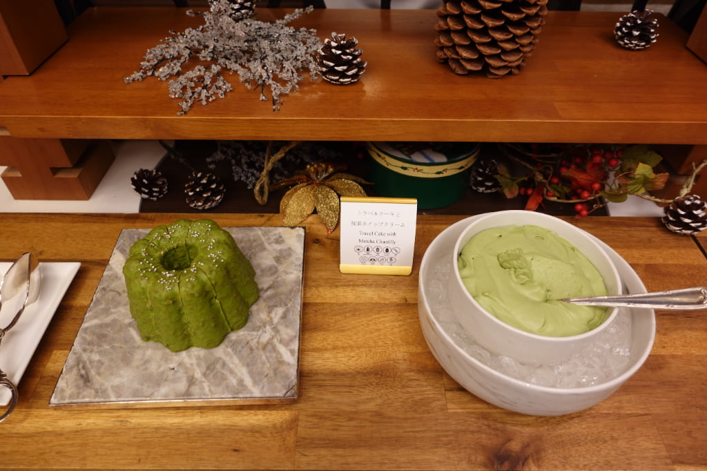 抹茶チョコレートでコーティングされたクグロフ型の「トラベルケーキと抹茶ホイップクリーム」は、抹茶ホイップクリームが別添え。とても抹茶の香りがよく味も濃厚なので、抹茶好きはたっぷり添えてくださいね。