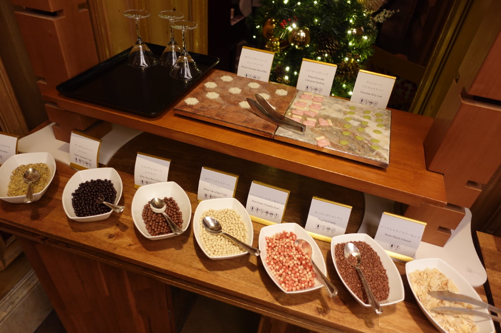 トッピング12種も用意されているので、そのままでも十分かわいいミニパフェをさらに自分好みに飾り付けできます。クリスマスモチーフのチョコレートのほか、ストロベリークランチパール、ポッピングキャンディなど、カラフルな色を足せるのも楽しい!