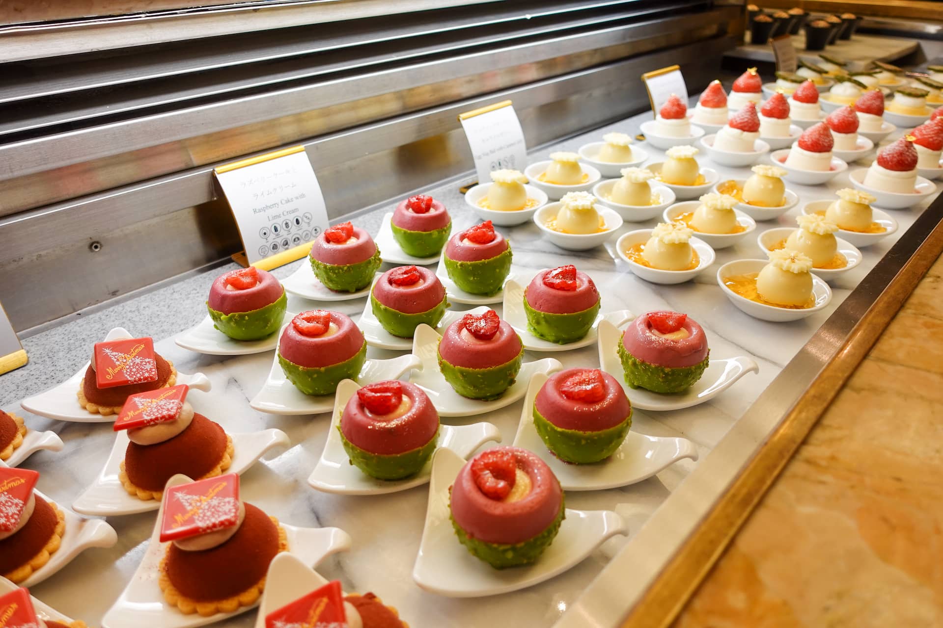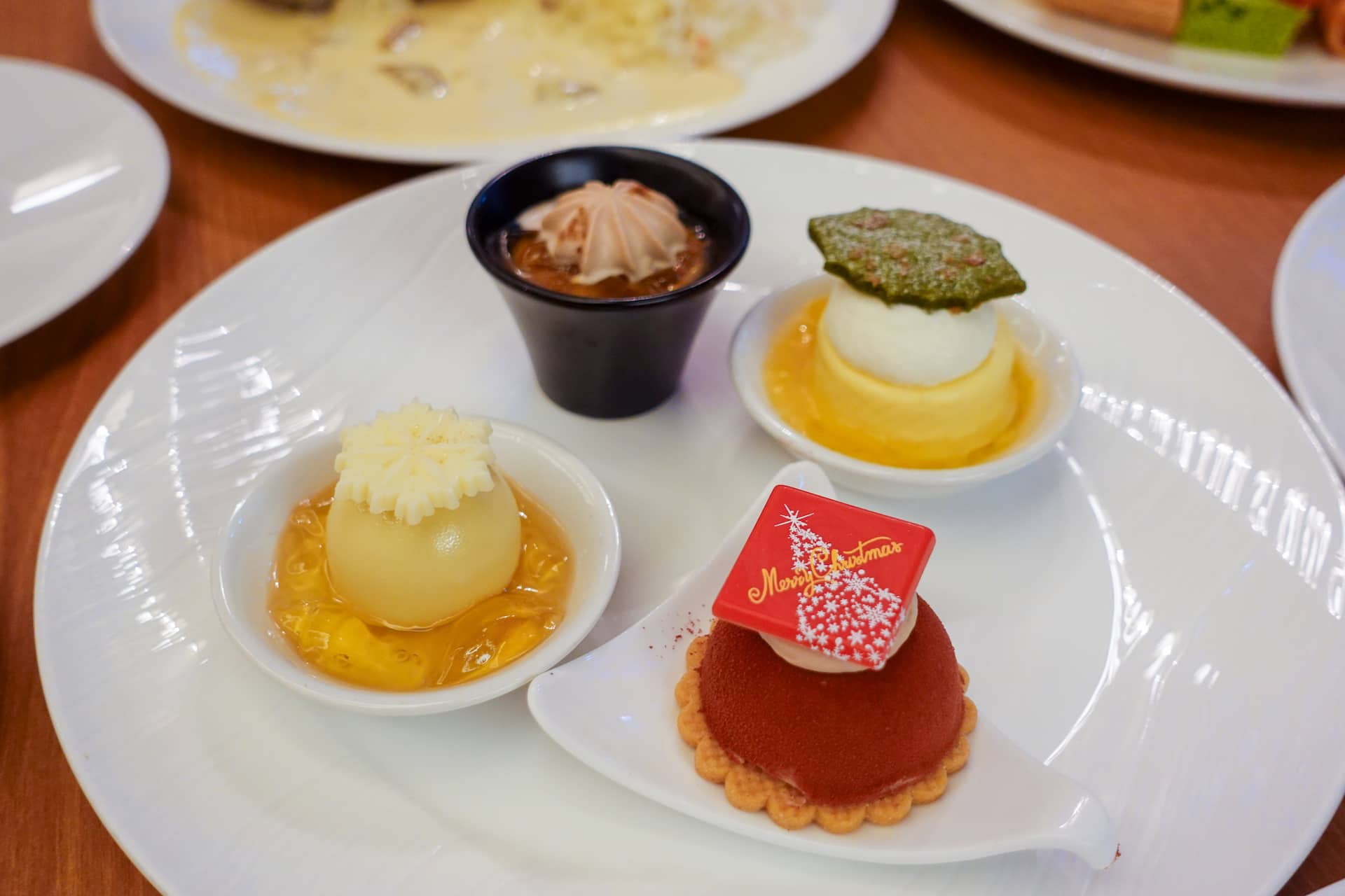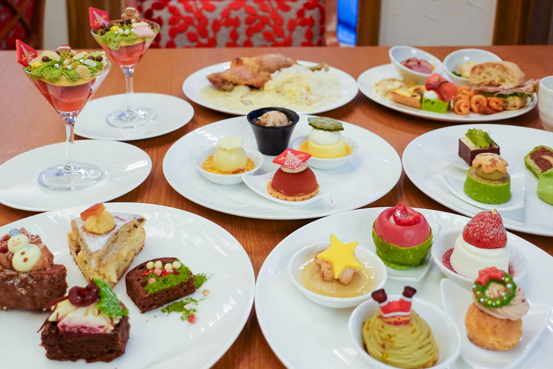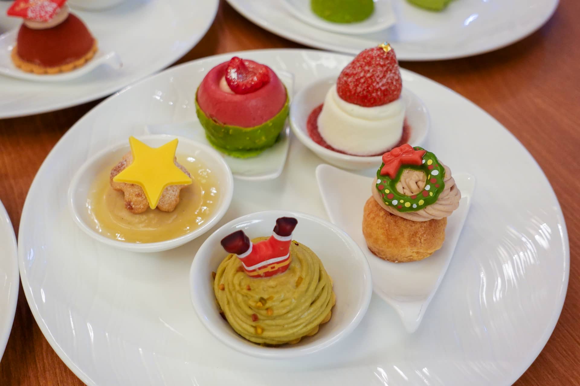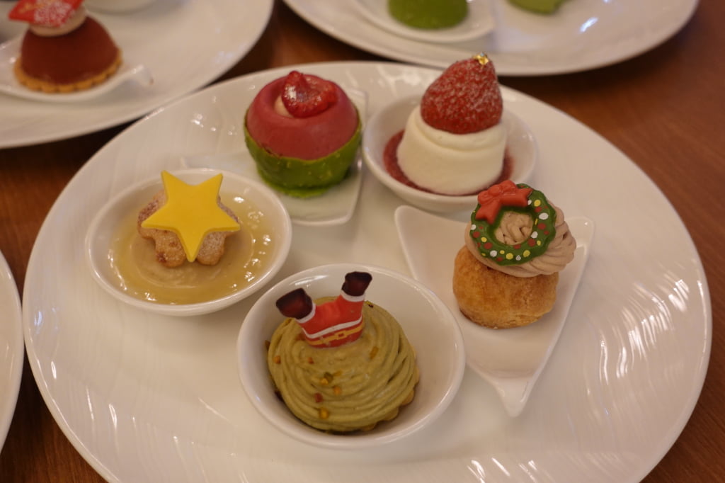 フロアのセンターにあるショーケースの中には、小皿にのせたミニスイーツがずらり。取りやすく食べやすく、見た目にもかわいいサイズ感です。サンタクロースやリース、雪だるまなど、クリスマスや冬のモチーフがあしらわれ、見ているだけでもワクワクします。
