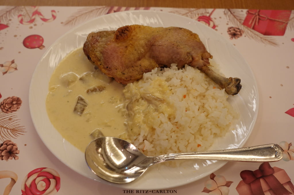 「ローストチキン ポルチーニとパルメザンのクリーミーソース」も必食! 隣に陳列された「オニオンとバターライス」と共にいただきます。ポルチーニ茸とパルメザンチーズのソースは濃厚なコクがあり、バターライスと見事に調和。パリッと焼き上げたローストチキンは香ばしく、濃厚なソースに負けない存在感です。