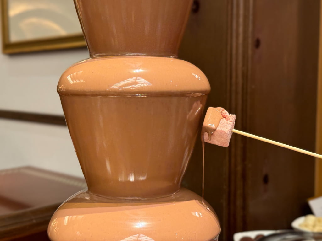 チョコレートをかける具材もストロベリーマシュマロ、ヘーゼルナッツサブレ、チョコレートケーキ、トリュフ、チョコレートチップマドレーヌと、そのまま食べてもおいしいものばかり。大人もテンションが上がるチョコレートファウンテンです。