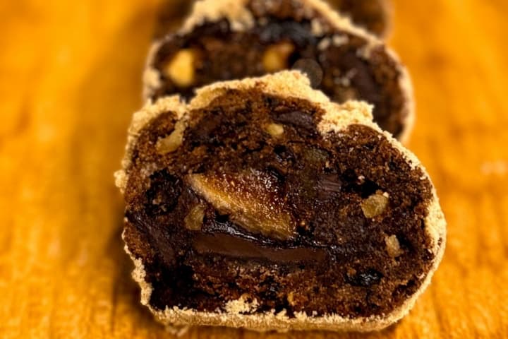 「boulangerie recolte(ブーランジェリーレコルト)」の「ショコラ・シュトーレン」は、クーベルチュールを使用し、自家製赤ワイン煮いちじくなどと一緒に焼きあげた逸品。イースト不使用(自家製酵母使用)、古代小麦、鹿児島の未精製糖、室戸の海洋深層水の塩など素材にもこだわっています。
