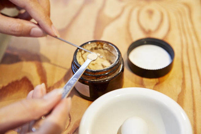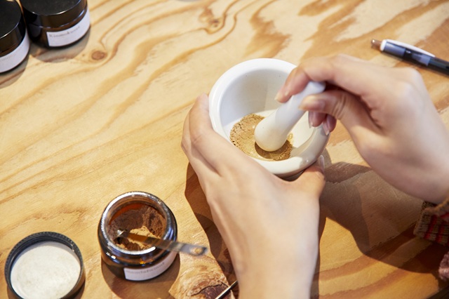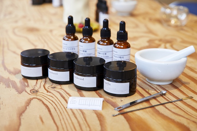 木のテーブルの上には粉末の香料やアロマオイルなど、体験に必要な材料がそろえられています。スタッフの方が丁寧に手順を教えてくれるので、初めてでも安心して体験することができます。