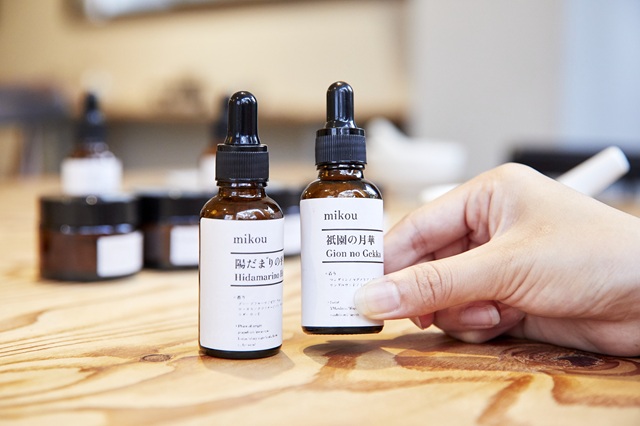 アロマオイルは京都をイメージした「mikou」オリジナルのもので、「陽だまりの平安」「美山の朝霧」「祇園の月華」「夕暮れの鴨川」の4種類からひとつ選べます。