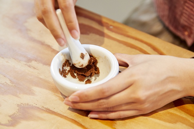 香料を混ぜ合わせたら、つなぎの役割をするタブノキの皮の粉末「たぶ粉」、水、アロマオイルを加えてペースト状にしていきます。