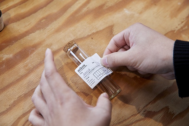 レシピノートのラベルをボトルに貼りつけ、タイトルをつけたら完成。できたてのお香はまだやわらかいため、一晩広げて乾燥させることが必要です。