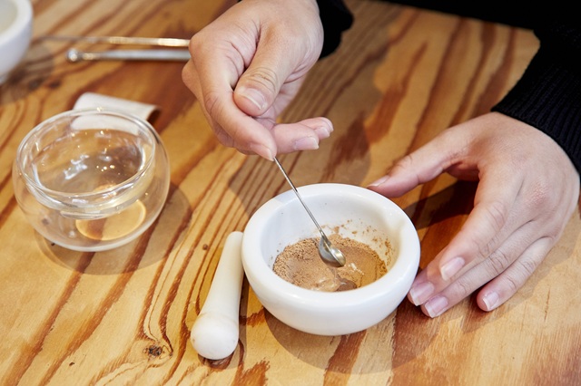 4種類の香料から好きな香りを選び、専用のスプーンで少しずつ白い器に投入。計10杯の香りを組み合わせて、混ぜていきます。