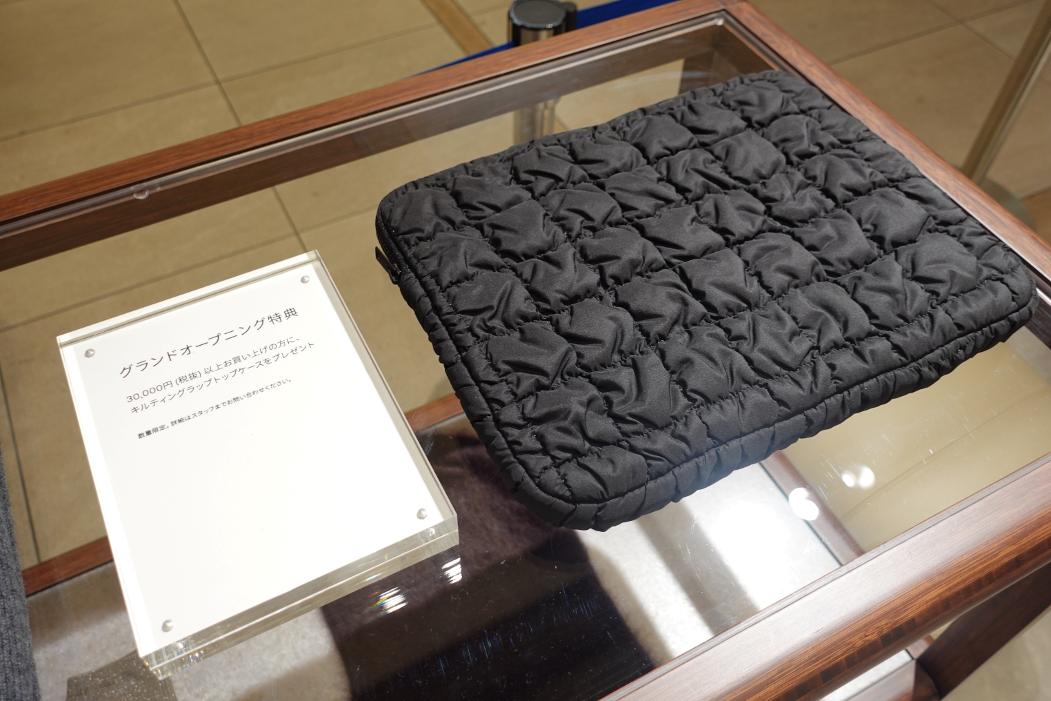 店内ではグランドオープニング特典として、商品を30,000円(税抜き)以上購入した方に「キルティングラップトップケース」をプレゼント中。柔らかい素材でサイズもちょうどよく、バッグインバッグとして大活躍しそうです!